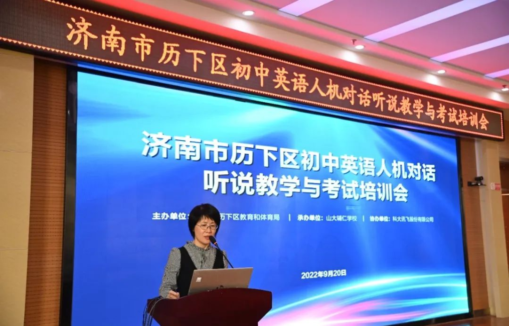 为满足英语听说机考教育改革需求,加快英语听说教学模式转变,提高英语听说教学质量,济南市历下区教体局在“历下智慧教育+因材施教项目”中建设了英语听说教考平台、英语听说教学系统及模拟考试系统。9月20日,济南市历下区初中英语人机对话听说教学与考试培训在山大辅仁学校举办,进一步探索英语听说教学新途径,全面发挥平台及系统的应用价值,保证各校英语听说教学课程有序开展。
